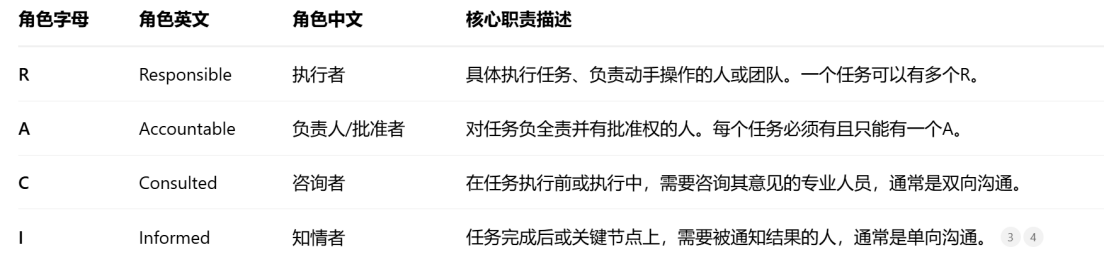 RACI模型是一个用于明确项目或流程中角色与职责的责任分配矩阵。它通过四个关键角色来厘清“谁该做什么”,有效避免职责不清和协作混乱。