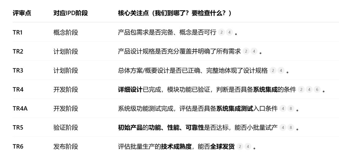 共 6 个阶段,TR4 以后才进入测试主流程简单来说,它是一系列在关键节点设置的“体检站”,目的是尽早发现技术风险,确保产品在进入下一阶段前足够成熟可靠。