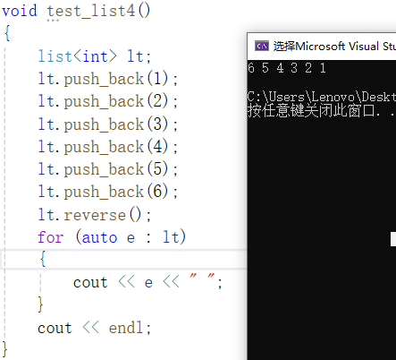 reverse实现list数据的逆置,lt.reverse(),逆置后结果为6,5,4,3,2,1,如(8)所示。