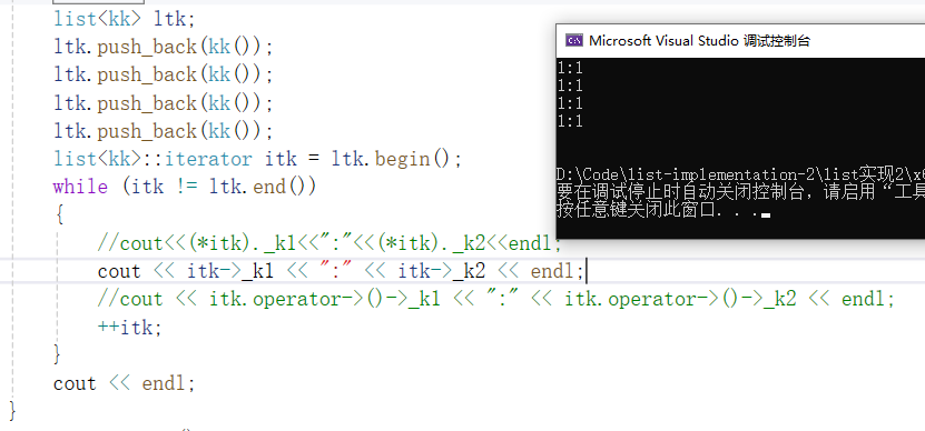 struct kk{int _k1 = 1;int _k2 = 1;};void test_list1(){list<kk> ltk;ltk.push_back(kk());ltk.push_back(kk());ltk.push_back(kk());ltk.push_back(kk());list<kk>::iterator itk = ltk.begin();while (itk != ltk.end()){//cout<<(*itk)._k1<<":"<<(*itk)._k2<<endl;cout << itk->_k1 << ":" << itk->_k2 << endl;//cout << itk.operator->()->_k1 << ":" << itk.operator->()->_k2 << endl;++itk;}cout << endl;}