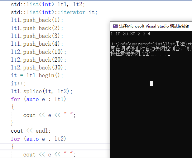 splice与merge类似,实现在链表指定位置插入链表,it指向链表第2个元素位置,lt1.splice(it,lt2),在it位置插入lt2,其功能类似剪切,故lt1结果为1,10,20,30,2,3,4,lt2中没有元素,如(11)所示。