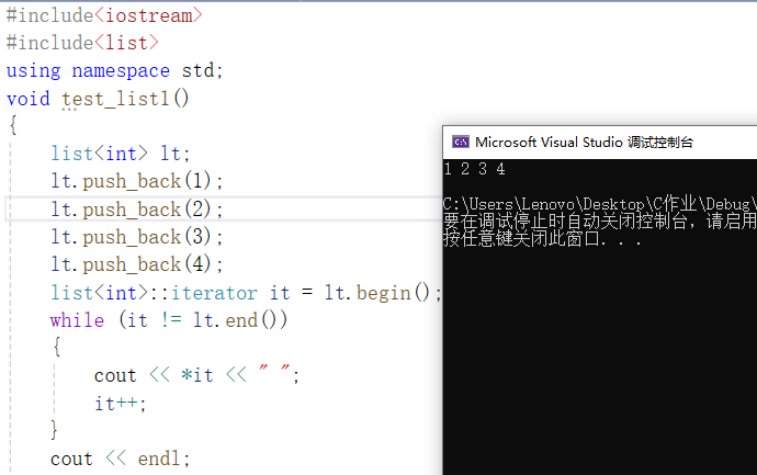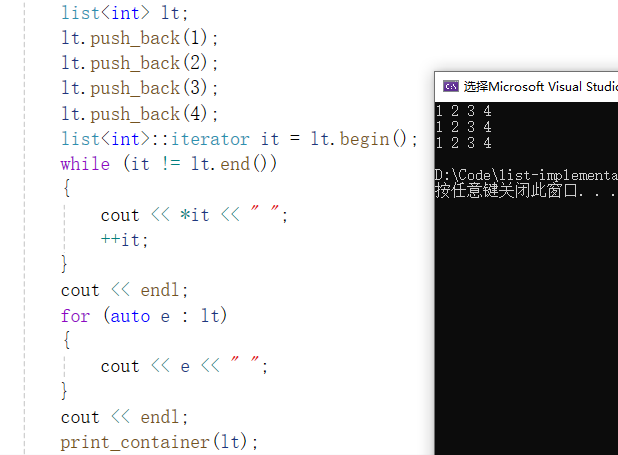 void test_list1(){list<int> lt;lt.push_back(1);lt.push_back(2);lt.push_back(3);lt.push_back(4);list<int>::iterator it = lt.begin();while (it != lt.end()){cout << *it << " ";++it;}cout << endl;for (auto e : lt){cout << e << " ";}cout << endl;print_container(lt);}