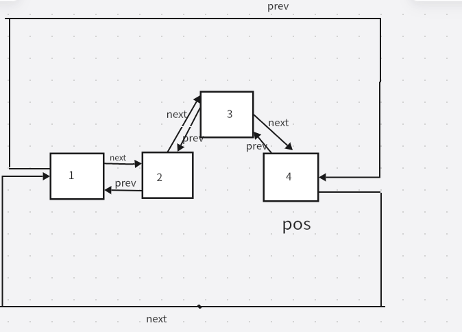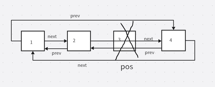 删除pos位置的结点3,需处理结点2、结点4的_prev、_next的指针问题,结点2的_next指针指向4,结点4的_prev指针指向2,同时也要释放结点3的空间,就完成了list结点的删除。