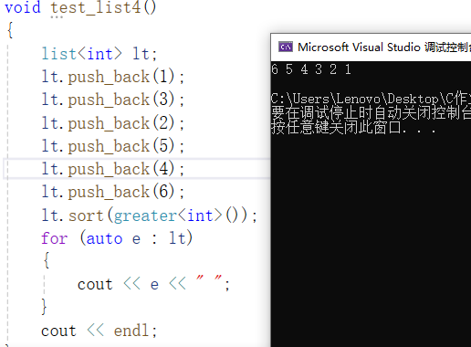 {list<int> lt;lt.push_back(1);lt.push_back(3);lt.push_back(2);lt.push_back(5);lt.push_back(4);lt.push_back(6);lt.sort(greater<int>());for (auto e : lt){cout << e << " ";}cout << endl;