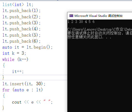 {list<int> lt;lt.push_back(1);lt.push_back(2);lt.push_back(3);lt.push_back(4);lt.push_back(5);lt.push_back(6);//lt.insert(lt.begin() + 3, 30);list迭代器不支持+、-操作auto it = lt.begin();int k = 3;while (k--){it++;}lt.insert(it, 30);for (auto e : lt){cout << e << " ";}cout << endl;
