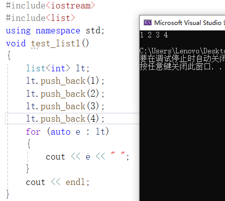 {list<int> lt;lt.push_back(1);lt.push_back(2);lt.push_back(3);lt.push_back(4);for (auto e : lt){cout << e << " ";}cout << endl;