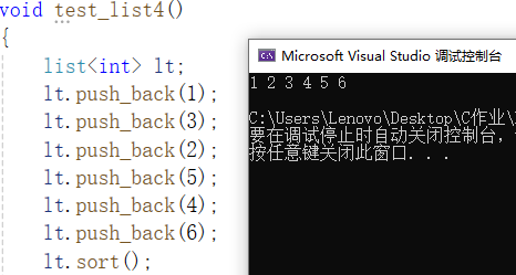 {list<int> lt;lt.push_back(1);lt.push_back(3);lt.push_back(2);lt.push_back(5);lt.push_back(4);lt.push_back(6);lt.sort();for (auto e : lt){cout << e << " ";}cout << endl;