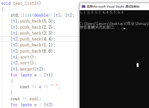 {std::list<double> lt1, lt2;lt1.push_back(5.5);lt1.push_back(2.2);lt1.push_back(3.3);lt2.push_back(4.4);lt2.push_back(1.1);lt2.push_back(6.6);lt1.sort();lt2.sort();lt1.merge(lt2);for (auto e : lt1){cout << e << " ";}cout << endl;for (auto e : lt2){cout << e << " ";}cout << endl;