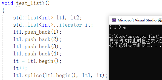 {std::list<int> lt1, lt2;std::list<int>::iterator it;lt1.push_back(1);lt1.push_back(2);lt1.push_back(3);lt1.push_back(4);it = lt1.begin();it++;lt1.splice(lt1.begin(), lt1, it);for (auto e : lt1){cout << e << " ";}cout << endl;
