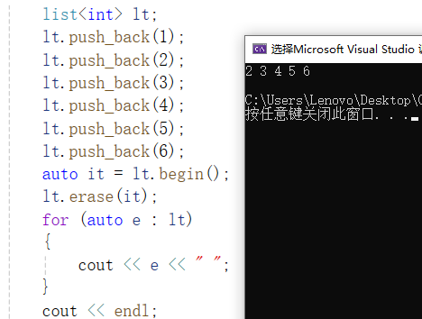 {list<int> lt;lt.push_back(1);lt.push_back(2);lt.push_back(3);lt.push_back(4);lt.push_back(5);lt.push_back(6);auto it = lt.begin();lt.erase(it);for (auto e : lt){cout << e << " ";}cout << endl;