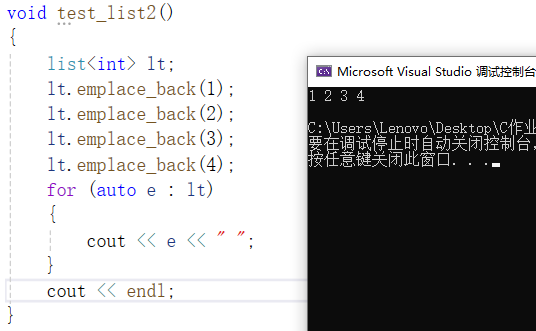 {list<int> lt;lt.emplace_back(1);lt.emplace_back(2);lt.emplace_back(3);lt.emplace_back(4);for (auto e : lt){cout << e << " ";}cout << endl;