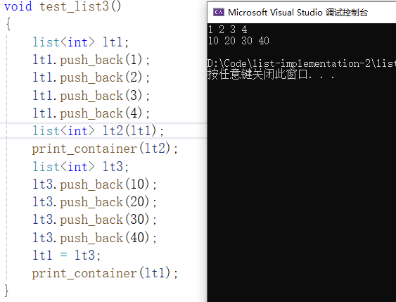 void test_list3(){list<int> lt1;lt1.push_back(1);lt1.push_back(2);lt1.push_back(3);lt1.push_back(4);list<int> lt2(lt1);print_container(lt2);list<int> lt3;lt3.push_back(10);lt3.push_back(20);lt3.push_back(30);lt3.push_back(40);lt1 = lt3;print_container(lt1);}