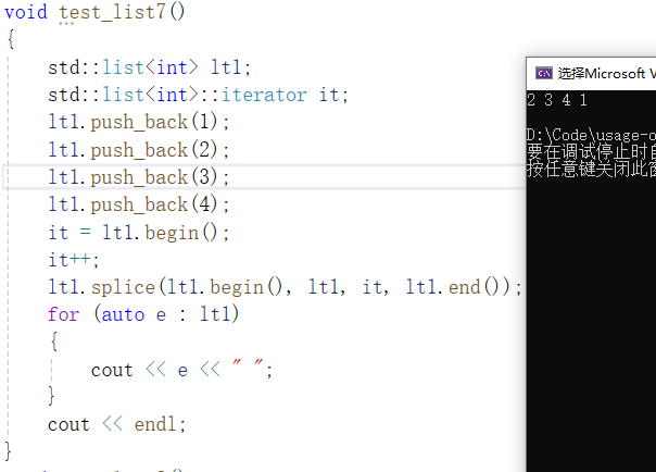 {std::list<int> lt1;std::list<int>::iterator it;lt1.push_back(1);lt1.push_back(2);lt1.push_back(3);lt1.push_back(4);it = lt1.begin();it++;lt1.splice(lt1.begin(), lt1, it, lt1.end());for (auto e : lt1){cout << e << " ";}cout << endl;