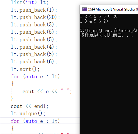 lt.sort(greater<int>()),这里通过传greater<int>的匿名对象来实现对lt的降序排序,结果为6,5,4,3,2,1,如(7)所示。