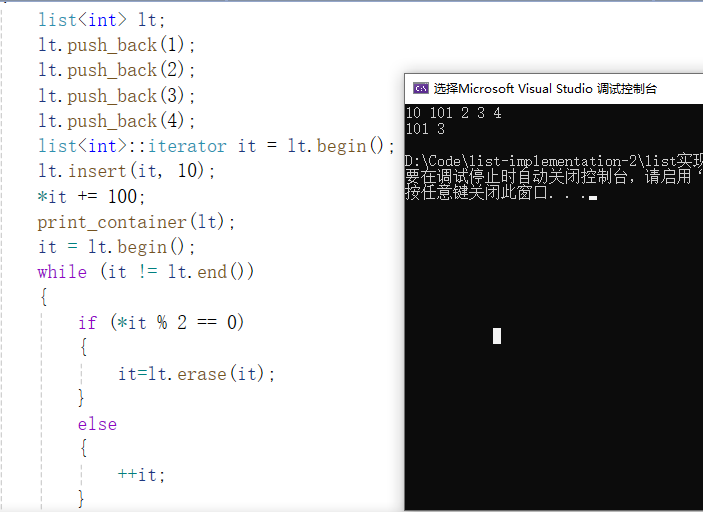 void test_list2(){list<int> lt;lt.push_back(1);lt.push_back(2);lt.push_back(3);lt.push_back(4);list<int>::iterator it = lt.begin();lt.insert(it, 10);*it += 100;print_container(lt);it = lt.begin();while (it != lt.end()){if (*it % 2 == 0){it=lt.erase(it);}else{++it;}}print_container(lt);}