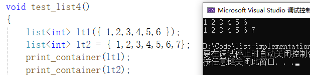 void test_list4(){list<int> lt1({ 1,2,3,4,5,6 });list<int> lt2 = { 1,2,3,4,5,6,7};print_container(lt1);print_container(lt2);}