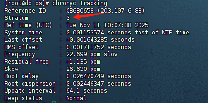 - 查看 NTP 同步详情(确认连接正常): chronyc tracking