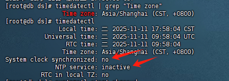 从输出能明确看到核心问题:NTP 服务未启动(inactive),系统也未同步(synchronized: no),这就是和其他机器差 1-2 分钟的根本原因!