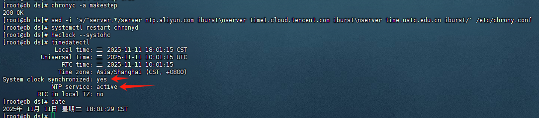 sed -i 's/^server.*/server ntp.aliyun.com iburst\nserver time1.cloud.tencent.com iburst\nserver time.ustc.edu.cn iburst/' /etc/chrony.conf# 重启chronyd让配置生效
