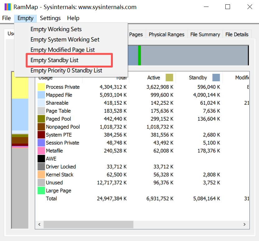 2、通过下载微软内存检测软件RAMmap.exe,查看下运行内存的分布情况,metafile占用内存比较多,采用手动方式清空缓存的方式,确实将缓存清空了,但过了一段时间内存还是会涨上来。