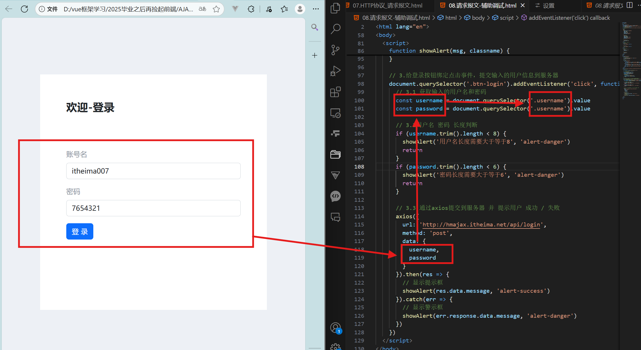 - 获取用户名输入框、密码输入框中的 value 值赋值给变量,给按钮添加点击事件,点击即发送请求,请求时将 参数传入