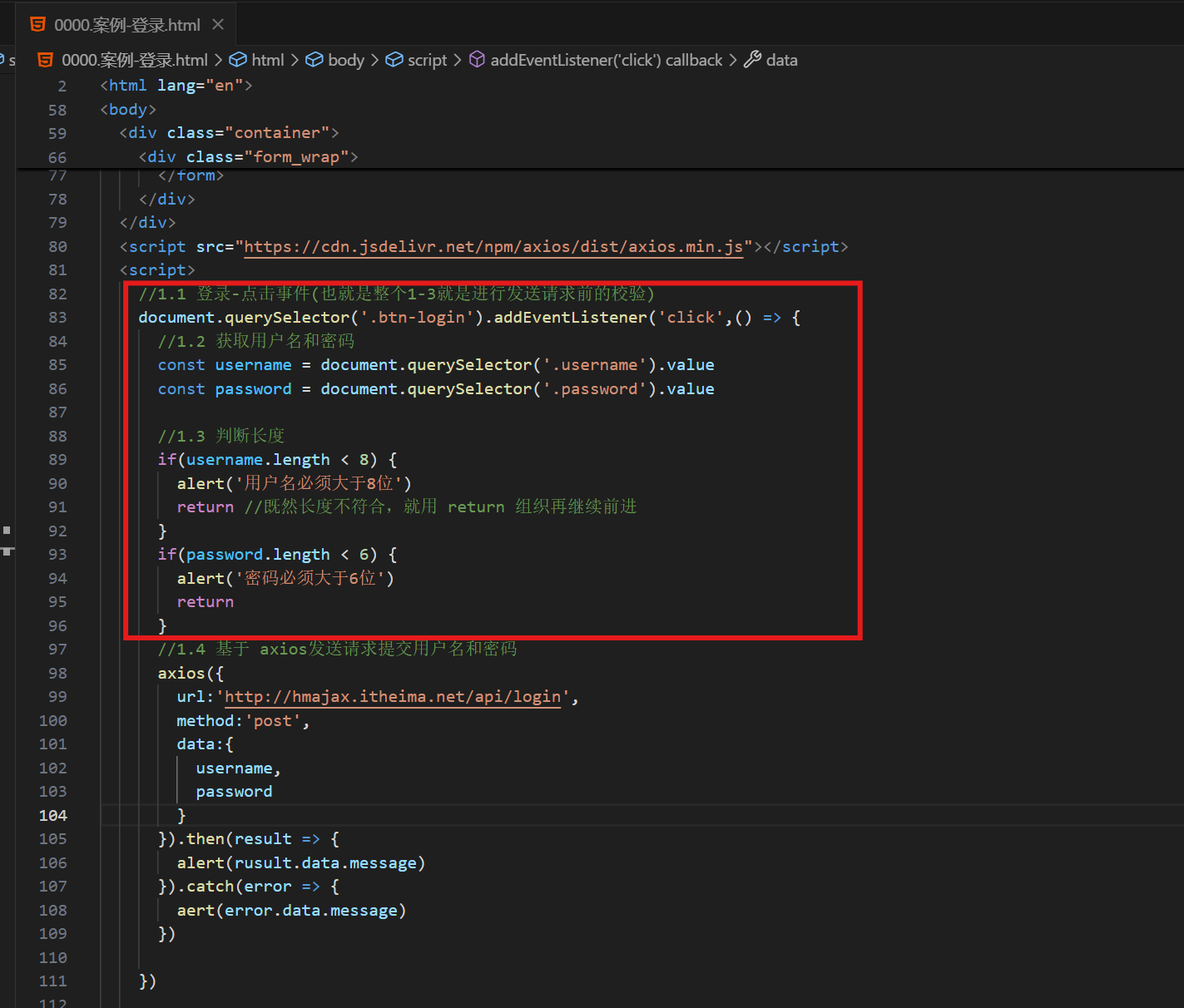 为按钮注册点击事件,点击之后获取输入框中输入的用户名和密码,简单进行用户名和密码的长度判断(长度不符合,用 return 组织代码继续进行)