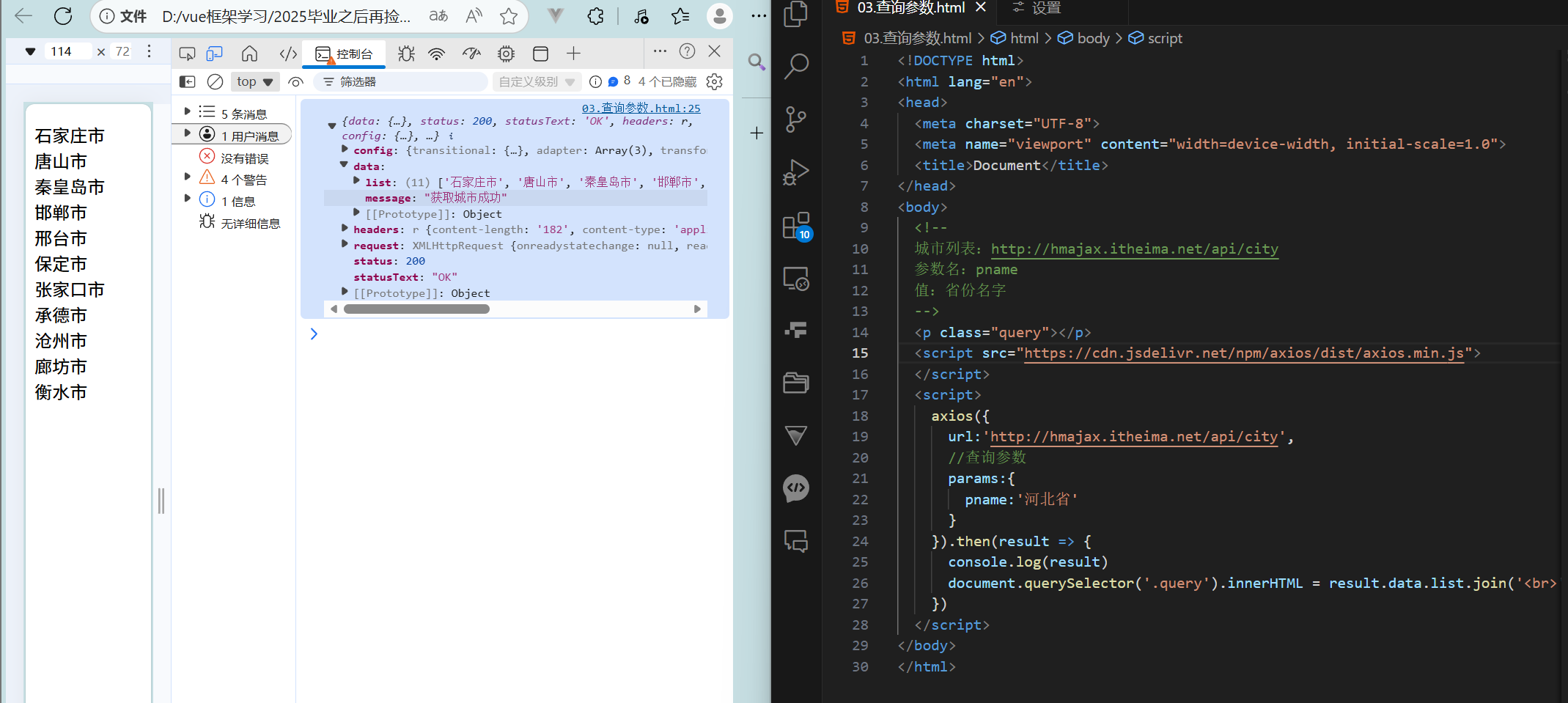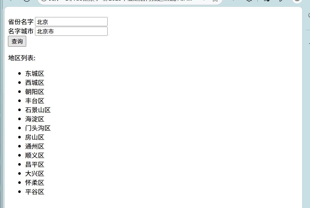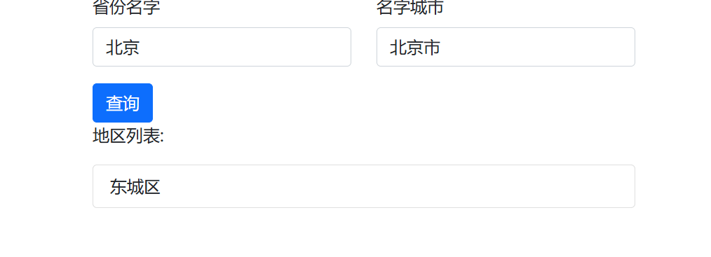 需求:根据树入的省份名字和城市名字,查询地区并渲染列表