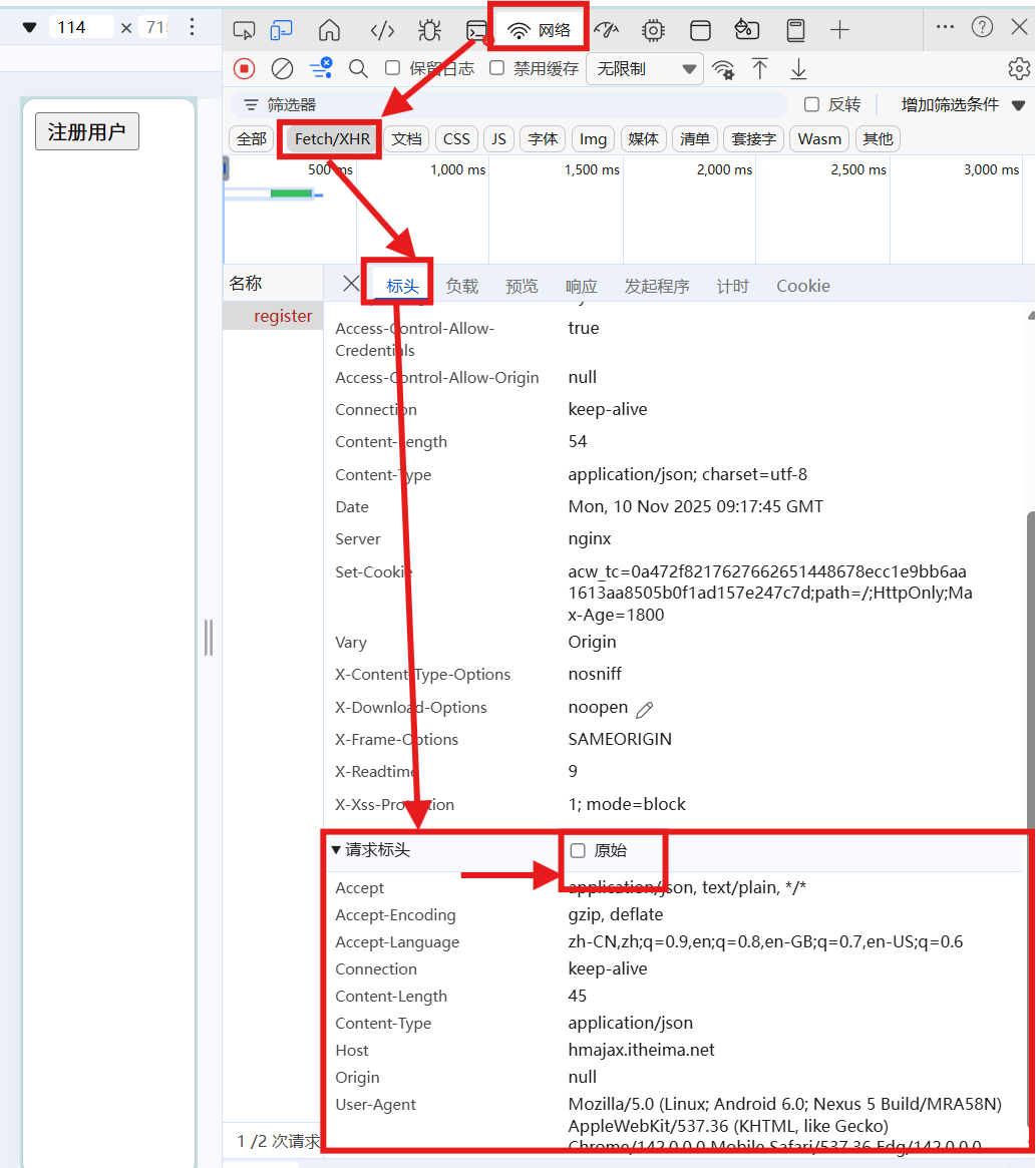 查看请求报文 :网络 --> Fetch / XHR --> 标头 / 负载