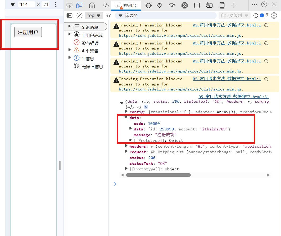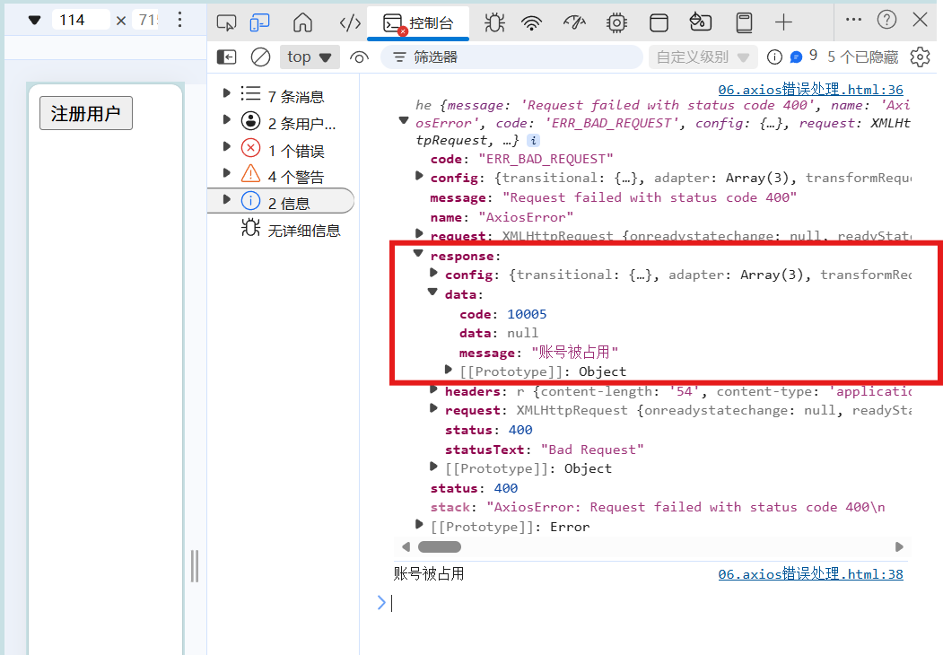 <body><button class="btn">注册用户</button><script src="https://cdn.jsdelivr.net/npm/axios/dist/axios.min.js"></script><script>/*注册用户:http://hmajax.itheima.net/api/register请求方法:POST参数名:username:用户名(中英文组成,最少8位)password:密码(最少6位)目标:点击按钮,通过axios提交用户和密码,完成注册需求:使用axios错误处理语法,拿到报错信息,弹框反馈给用户*/document.querySelector('.btn').addEventListener('click',() => {axios({url:"http://hmajax.itheima.net/api/register",//指定请求方法method:'post',//提交数据data:{username:'ithaima789',password:'123456'}}).then(result => {console.log(result)//catch方法拿到错误,还要传入一个回调函数}).catch(error => {//处理错误信息console.log(error)//把真正错误原因取出来console.log(error.response.data.message)alert(error.response.data.message)})})</script></body>