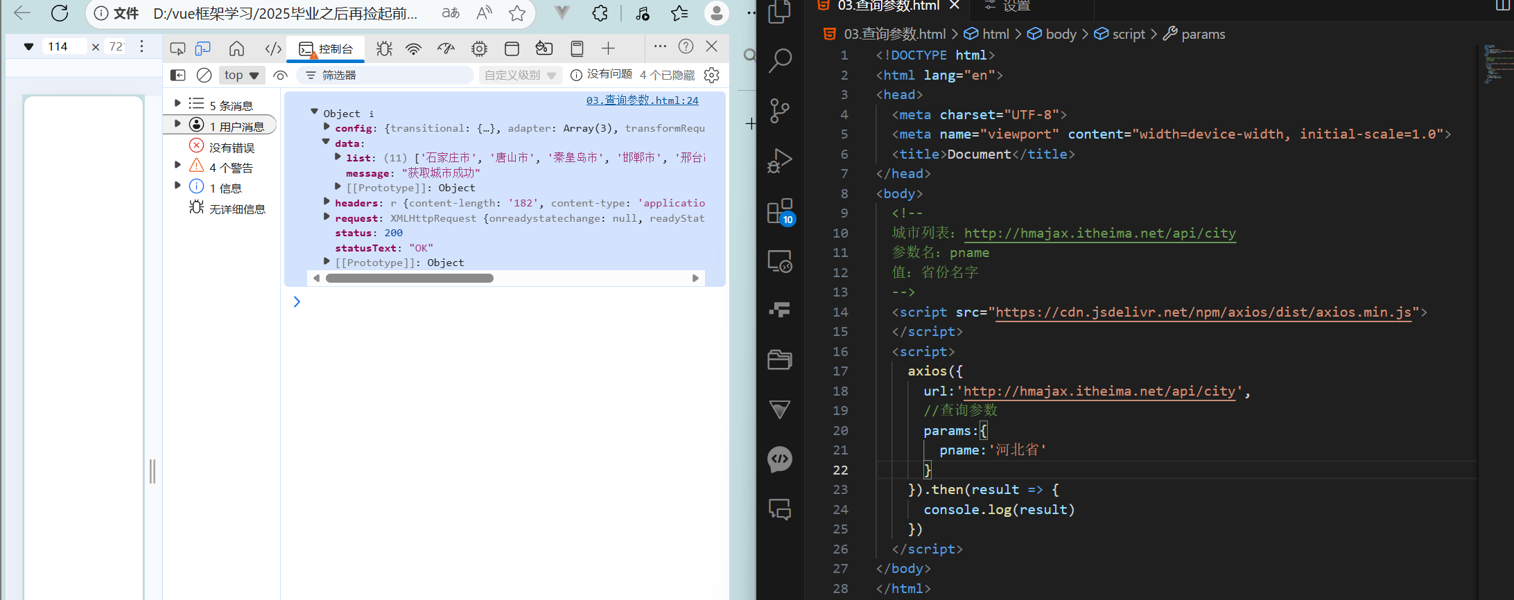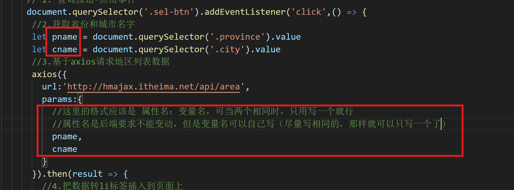 <body><div class="container"><form class="row" id="editForm"><!-- 输入省份名字 --><div class="mb-3 col"><label class="form-label">省份名字</label><input type="text" value="北京" name="province" class="form-control province" placeholder="请树入省份名称"></div><!-- 输入城市名字 --><div class="mb-3 col"><label class="form-label">名字城市</label><input type="text" value="北京市" name="city" class="form-control city" placeholder="请输入城市名字"></div></form><button type="button" class="btn btn-primary sel-btn">查询</button><br><p>地区列表:</p><ul class="list-group"><li class="list-group-item">东城区</li></ul></div><script src="https://cdn.jsdelivr.net/npm/axios/dist/axios.min.js"></script><script>/*获取地区列表: http://hmajax.itheima.net/api/area查询参数:pname: 省份或直辖市名字cname: 城市名字*/// 目标: 根据省份和城市名字, 查询地区列表// 1. 查询按钮-点击事件document.querySelector('.sel-btn').addEventListener('click',() => {//2.获取省份和城市名字let pname = document.querySelector('.province').valuelet cname = document.querySelector('.city').value//3.基于axios请求地区列表数据axios({url:'http://hmajax.itheima.net/api/area',params:{pname,cname}}).then(result => {//4.把数据转li标签插入到页面上let list = result.data.listconsole.log(list)//遍历数组中每个元素,这里用areaName表示每个元素,将每个元素包含在li标签中let theLi = list.map(areaName => `<li class="list-group-item">${areaName}</li>`).join('')console.log(theLi)//innerHTML能直接识别标签,在网页中显示出小圆点document.querySelector('.list-group').innerHTML = theLi})})</script></body>