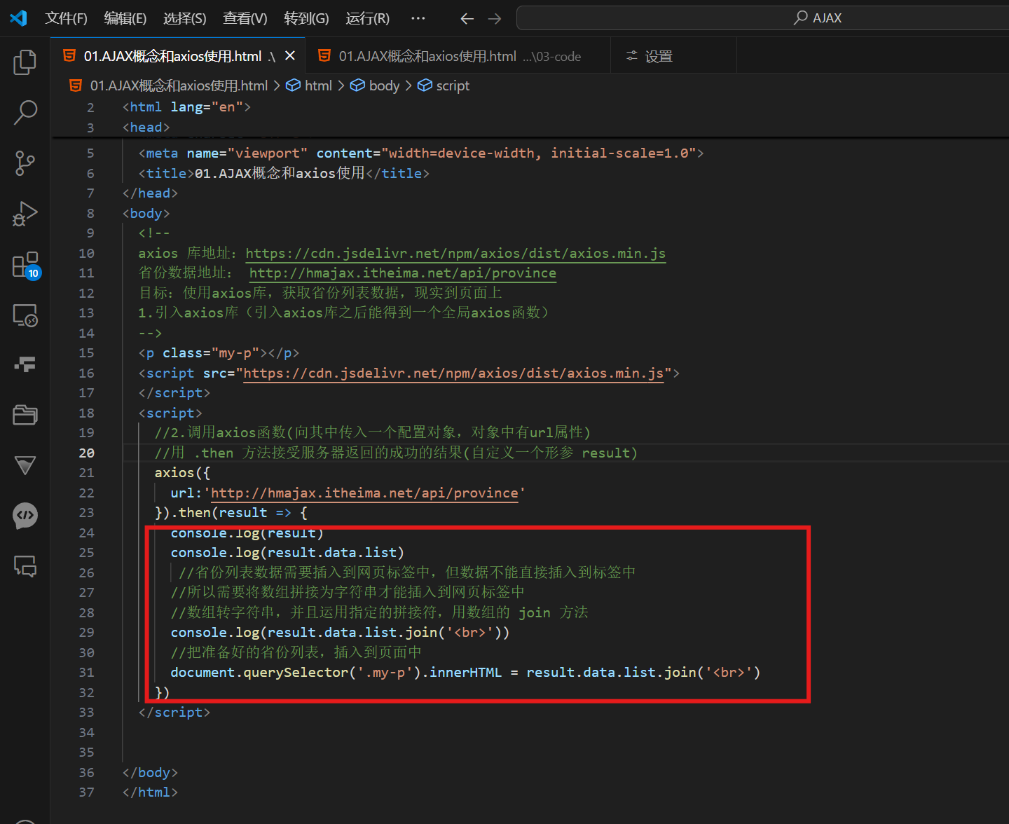 axios作为第三方库,在使用时需要将该库相关的 js 代码引入到自身网页中,然后会得到一个全局的 axios函数,那么就能调用该函数了。(注意:① axios函数中传入配置对象 ② 用 .then回调函数接收结果,并做后续处理)