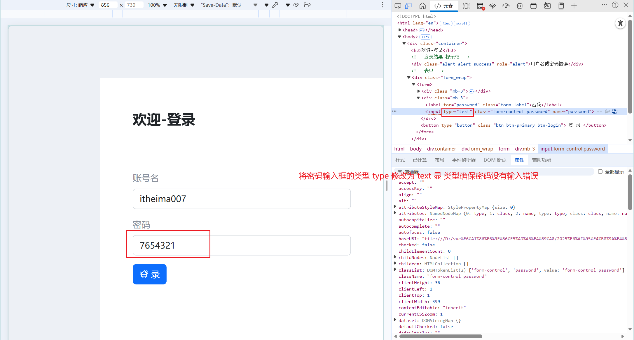 - 打开开发者工具,将源码中 input 输入框中 密码框类型 type 设置为 text 可见,确保密码没有输入错误