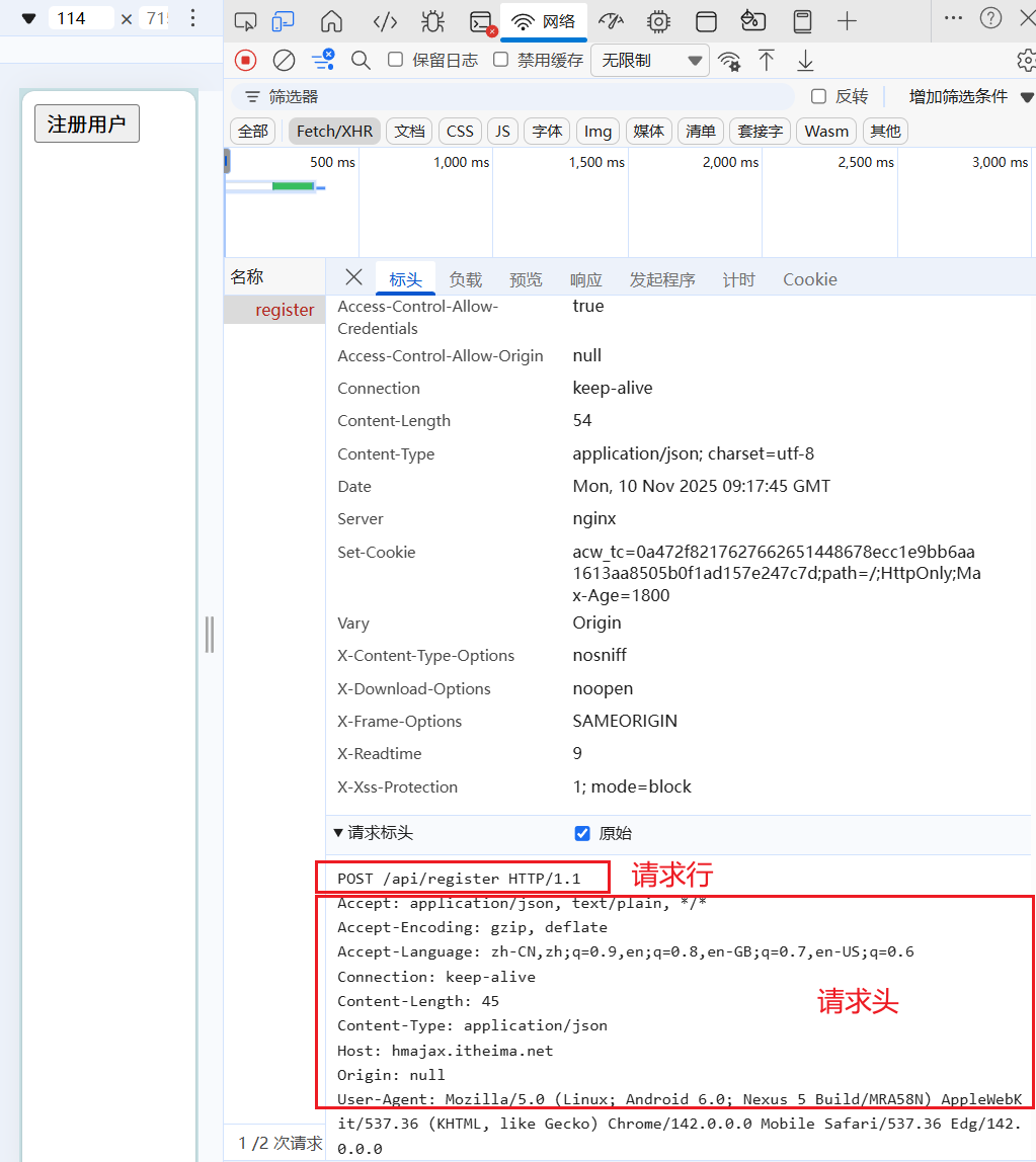 | 2.请求头 | 以键值对的格式携带的附加信息,比如Content-Type |
