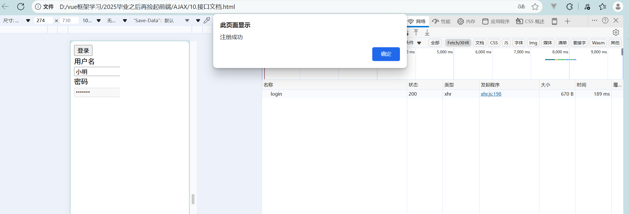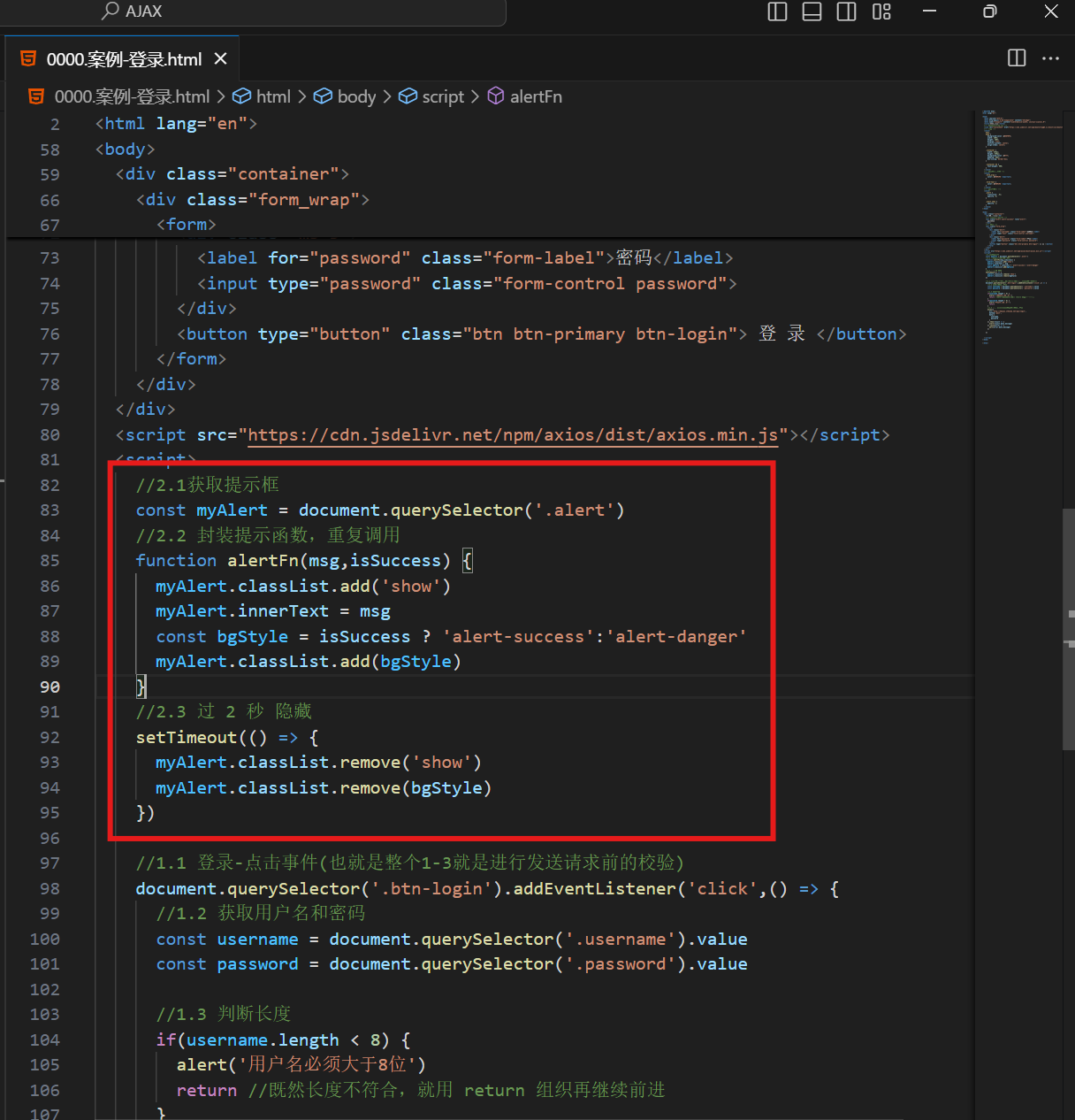 注意:在成功时需要提示框,失败时需要提示框,密码和用户名长度不符合规范时需要提示框,都是一样的逻辑,所以直接将之封装为函数