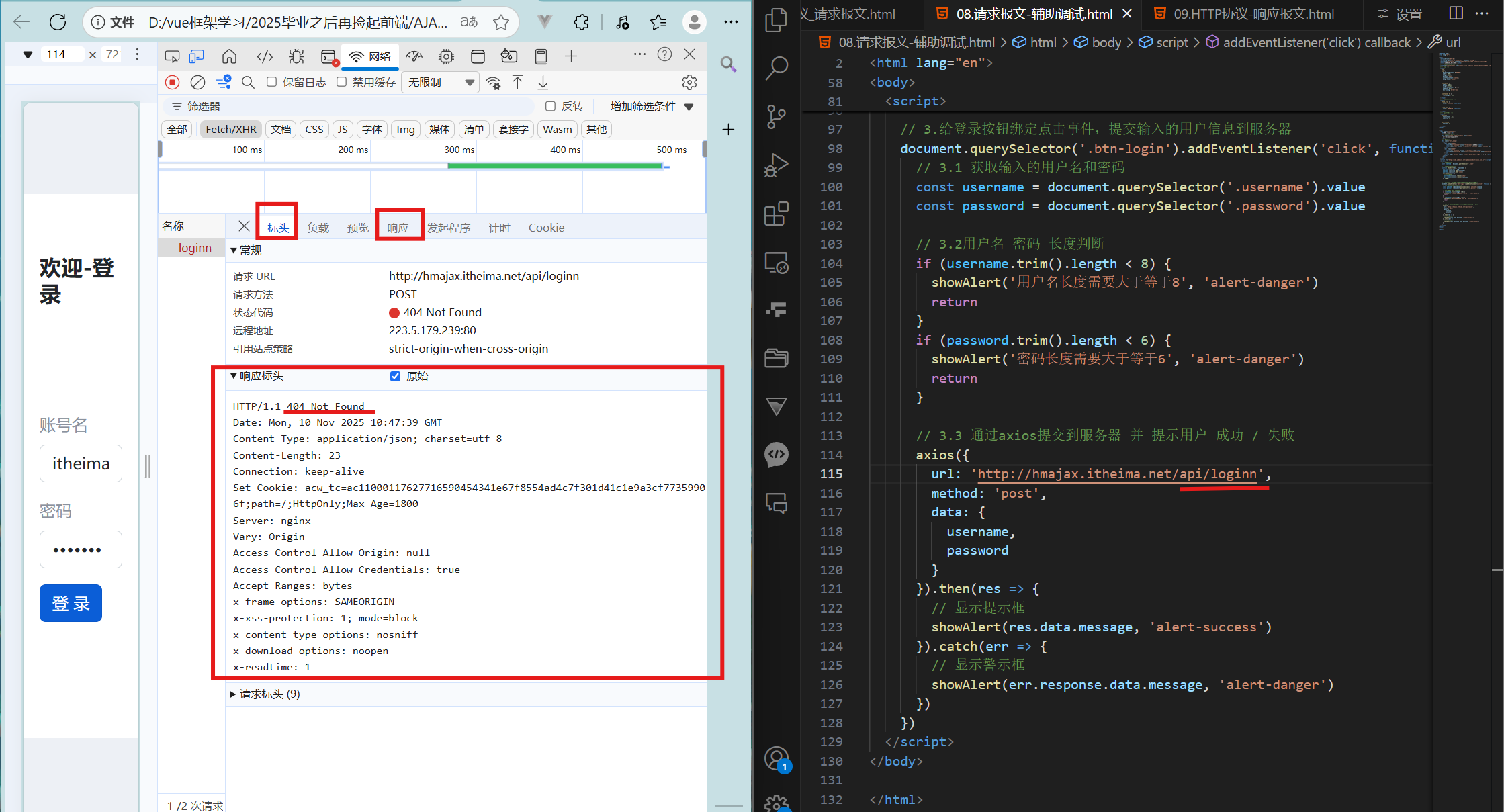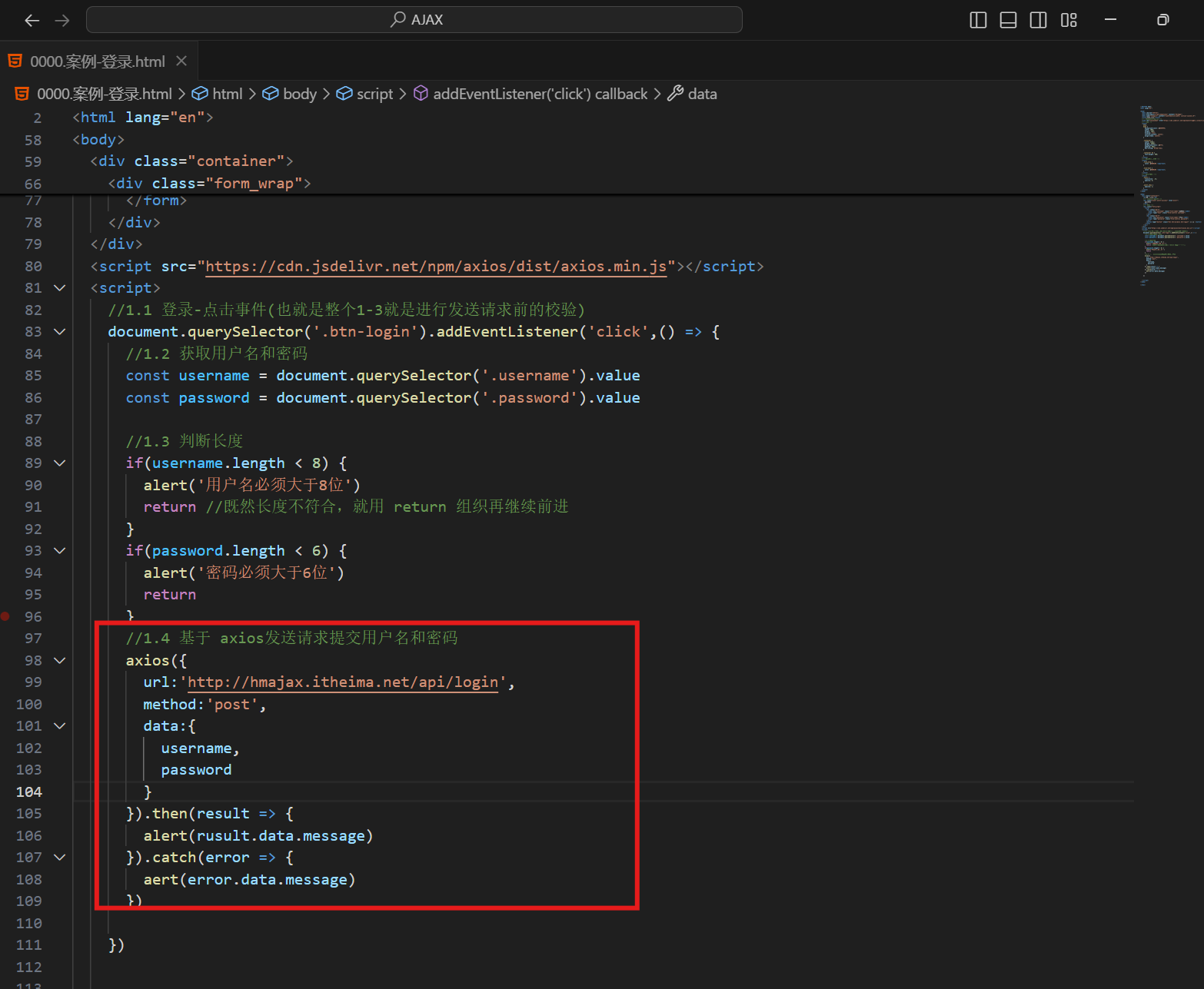 </head><body><div class="container"><h3>欢迎-登录</h3><!-- 登录结果-提示框 --><div class="alert alert-success" role="alert">提示消息</div><!-- 表单 --><div class="form_wrap"><form><div class="mb-3"><label for="username" class="form-label">账号名</label><input type="text" class="form-control username"></div><div class="mb-3"><label for="password" class="form-label">密码</label><input type="password" class="form-control password"></div><button type="button" class="btn btn-primary btn-login"> 登 录 </button></form></div></div><script src="https://cdn.jsdelivr.net/npm/axios/dist/axios.min.js"></script><script>// 目标1:点击登录时,用户名和密码长度判断,并提交数据和服务器通信// 目标2.使用提示框,反馈提示信息// 2.1 获取提示框const myAlert = document.querySelector('.alert')//2.2 封装提示函数,重复调用,满足提示需求// 功能 :// 1.显示提示框// 2.不同提示文字msg,成功绿色,失败红色isSuccess(true成功,false失败)// 3.过2 秒后,让提示框自动消失function alertFn(msg,isSuccess) {//1.显示提示框 myAlert.classList.add('show')//2.实现细节(给提示框中放入消息)myAlert.innerText = msg//给框设置背景色,如果外边传进来是 true ,那么就给出一个成功类名,否则是失败类名const bgStyle = isSuccess ? 'alert-success':'alert-danger'//确认类名之后将其添加到提示框中myAlert.classList.add(bgStyle)//3. 过2秒隐藏setTimeout(() => {myAlert.classList.remove('show')//提示:避免类名冲突,重置背景色,也就是文字和背景色要一同消失myAlert.classList.remove(bgStyle)},2000)}// 1.1 登录-点击事件document.querySelector('.btn-login').addEventListener('click', () => {// 1.2 获取用户名和密码const username = document.querySelector('.username').valueconst password = document.querySelector('.password').value// console.log(username, password)// 1.3 判断长度if (username.length < 8) {alertFn('用户名必须大于8位',false)return // 阻止代码继续执行}if (password.length < 6) {alertFn('密码必须大于等于6位',false)return // 阻止代码继续执行}// 1.4 基于axios提交用户名和密码// console.log('提交数据到服务器')axios({url: 'http://hmajax.itheima.net/api/login',method: 'POST',data: {username,password}}).then(result => {console.log(result)//想在表面展现后端给出的message提示信息,直接右键复制路径alertFn(result.data.message,true)}).catch(error => {console.log(error)alertFn(error.data.message,false)})})</script>