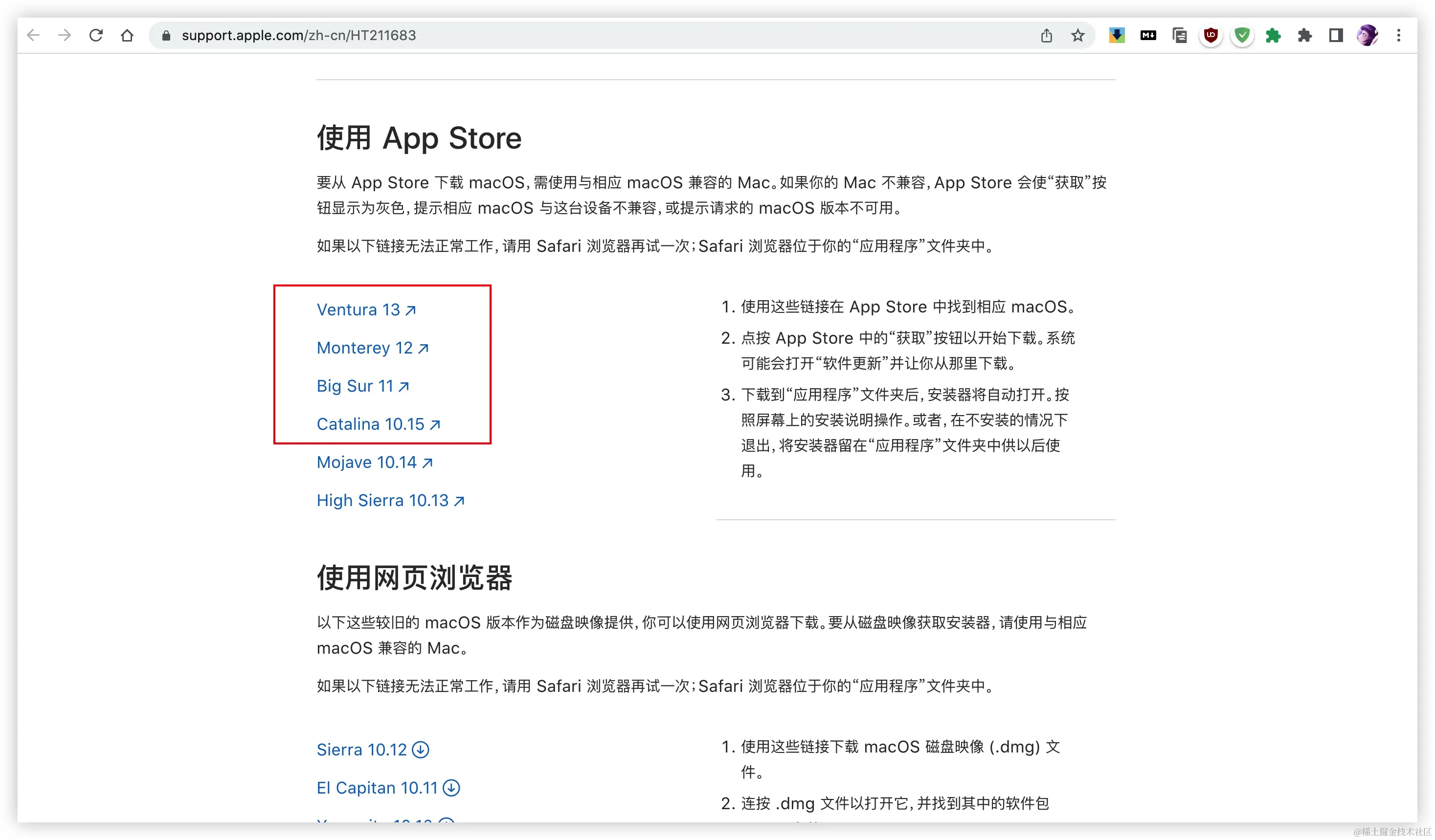 技巧 | 如何给 MacOS 更新到指定版本系统 当需要给 Mac 升级系统时,发现默认是升级到最新版本。 有些小伙伴可能会跟我一样,想要将系统往上升级一个版本就行。我们可以按照以下步骤进行操作: 在Apple网站,Apple - 技术支持 - 搜索 (中国),搜索指定的系统版本做下载 网址:support.apple.com/zh-cn/HT211… 选择指定版本,点击打开 App Store 进行获取 等待下载安装,然后重启