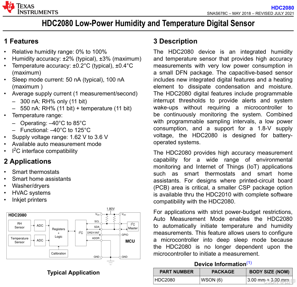 HDC2080是TI的一款低功耗温湿度数字传感器。