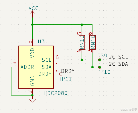 HDC2080的ADDR引脚用于配置HDC2080的I2C总线地址。