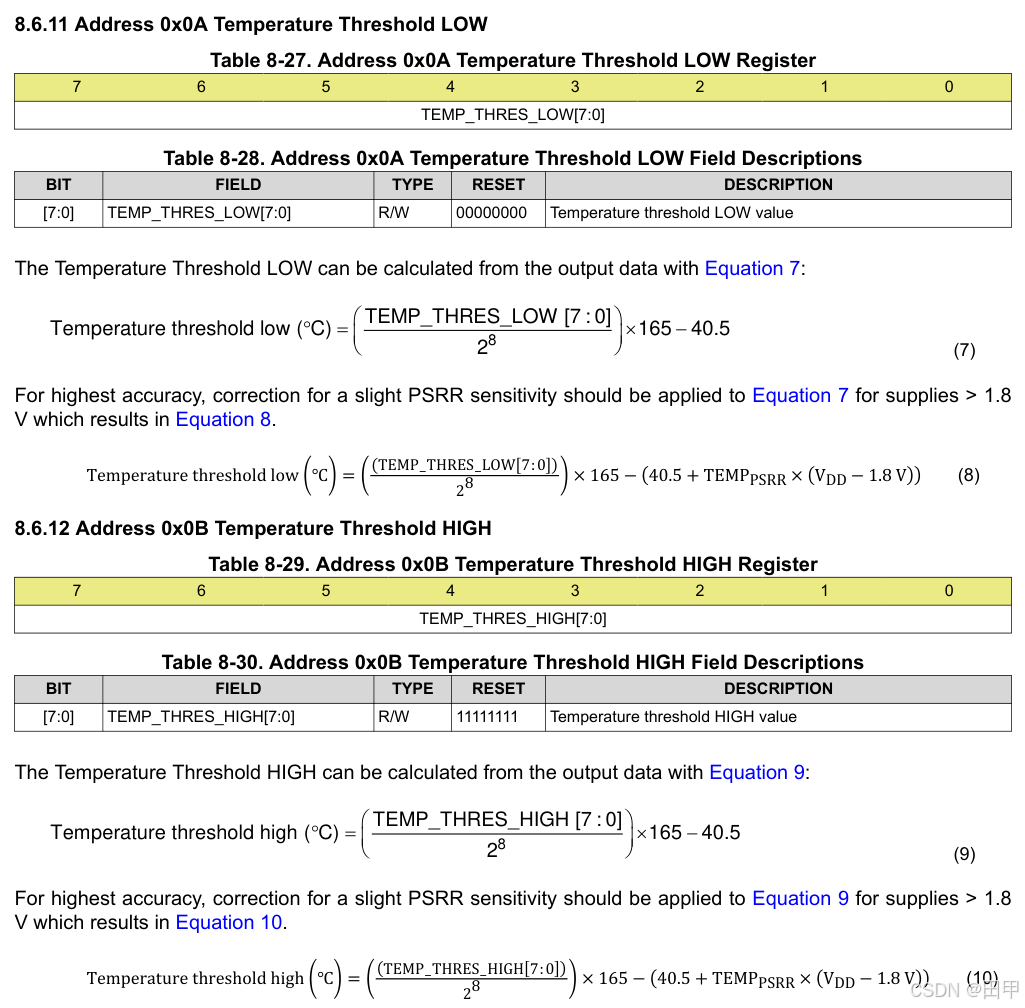 一个LSB约为0.644摄氏度,设置低门槛10度,高门槛28度,则寄存器值分别是78和106。