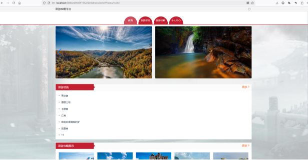 首页是用户访问系统的第一个页面,主要展示网站的核心内容和导航信息。通过简洁、直观的布局,首页提供了访问旅游资讯、旅游攻略、景点推荐等主要功能的入口。用户可以在首页查看推荐的旅游资讯、热门旅游攻略以及最新的景点信息,快速了解当前旅游趋势和旅行建议。同时,首页还包括用户登录、注册入口,便于用户进行个性化设置和查看个人信息。首页的设计注重响应式布局,确保在不同设备(PC、手机等)上均有良好的用户体验。