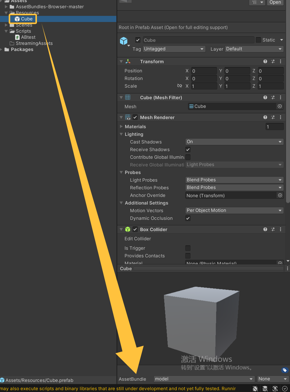加载AB包后就可以加载AB包的资源。可以直接调用api用资源的名字加载,如我想要加载上一步中打包在model包中的Cube:ab.LoadAsset("Cube");