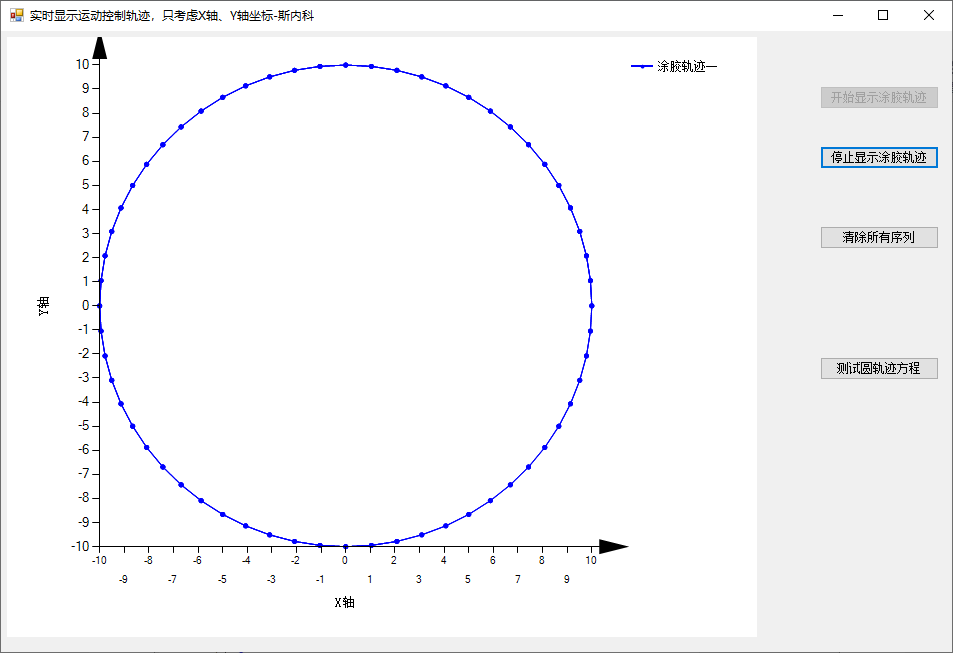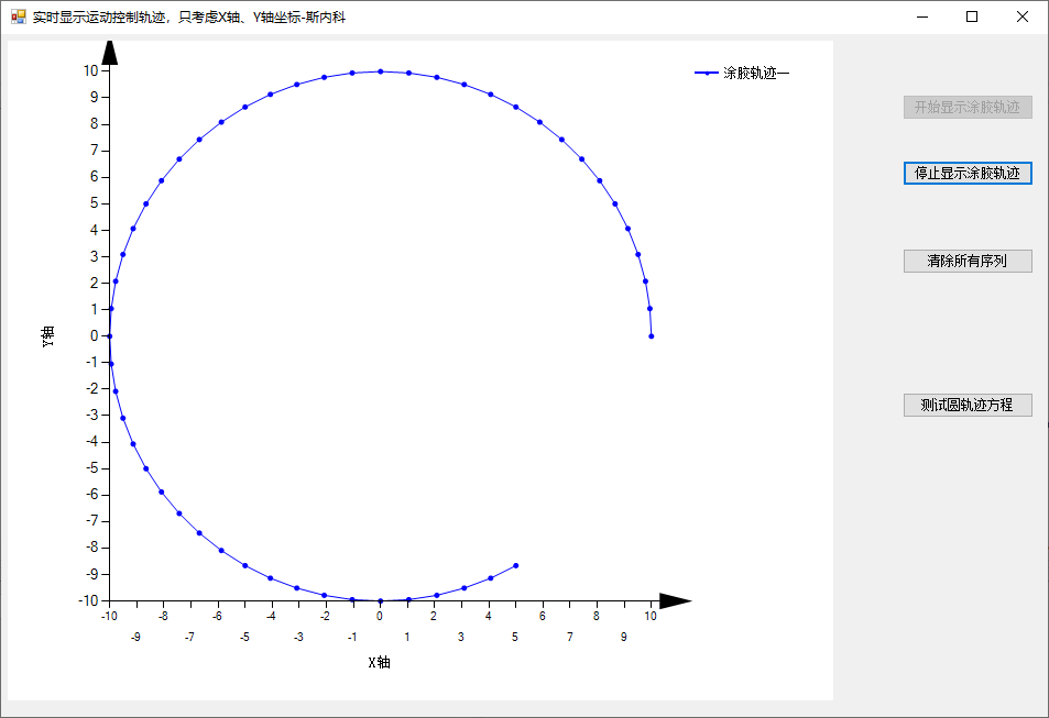 {public partial class FormShowGlueTrack : Form{public FormShowGlueTrack(){InitializeComponent();this.SetStyle(ControlStyles.DoubleBuffer, true);}private void FormShowGlueTrack_Load(object sender, EventArgs e){CncGlobal.CreateOneTrackSeriesEvent += CncGlobal_CreateOneTrackSeriesEvent;CncGlobal.ClearGlueTrackEvent += CncGlobal_ClearGlueTrackEvent;chart1.Width = 750; // 设置宽度chart1.Height = 600; // 设置高度,确保宽度和高度相同.形成一个正方形.实际测试需要XY比例为5:4chart1.ChartAreas[0].AxisX.IsStartedFromZero = true;chart1.ChartAreas[0].AxisY.IsStartedFromZero = true;chart1.ChartAreas[0].AxisX.Minimum = -10;chart1.ChartAreas[0].AxisX.Maximum = 10; // 或任何其他合适的值chart1.ChartAreas[0].AxisY.Minimum = -10;chart1.ChartAreas[0].AxisY.Maximum = 10; // 或任何其他合适的值// 设置X轴的刻度chart1.ChartAreas[0].AxisX.Interval = 1; // 设置X轴的间隔为1chart1.ChartAreas[0].AxisX.IntervalType = DateTimeIntervalType.Number; // 设置为数字类型// 设置Y轴的刻度chart1.ChartAreas[0].AxisY.Interval = 1; // 设置Y轴的间隔为1chart1.ChartAreas[0].AxisY.IntervalType = DateTimeIntervalType.Number; // 设置为数字类型chart1.ChartAreas[0].AxisX.ArrowStyle = AxisArrowStyle.SharpTriangle;//轴显示箭头chart1.ChartAreas[0].AxisY.ArrowStyle = AxisArrowStyle.SharpTriangle;//轴显示箭头chart1.ChartAreas[0].AxisX.MajorGrid.Enabled = false;//隐藏X网格线chart1.ChartAreas[0].AxisY.MajorGrid.Enabled = false;//隐藏Y网格线chart1.ChartAreas[0].AxisX.Title = "X轴";chart1.ChartAreas[0].AxisX.TitleFont = new Font("宋体", 10);chart1.ChartAreas[0].AxisY.Title = "Y轴";chart1.ChartAreas[0].AxisY.TitleFont = new Font("宋体", 10);chart1.Series.Clear();//清除默认序列Task.Factory.StartNew(() => {while (true){if (CncGlobal.IsShowGlueTrack){double X_POS = 0;double Y_POS = 0;double Z_POS = 0;bool actionResult = CncGlobal.GetAxisPosition(ref X_POS, ref Y_POS, ref Z_POS);if (actionResult){RefreshChart(X_POS, Y_POS);}else{#region 测试功能使用,正式环境需删除/*x += direction * 10;if (x >= 1000){direction = -1;}else if (x <= 100){direction = 1;}y = x <= 500 ? 200 : 300;RefreshChart(x, y);*/#endregion}}System.Threading.Thread.Sleep(100);}});}private void CncGlobal_CreateOneTrackSeriesEvent(string seriesName){if (!IsHandleCreated){return;}this.BeginInvoke(new Action(() =>{Series series = new Series(seriesName);series.Color = Color.Blue;//chart1.Series[0].Name = "涂胶轨迹一";//chart1.Series[0].IsValueShownAsLabel = true; //显示Y轴的具体值series.MarkerStyle = MarkerStyle.Circle;series.ChartType = SeriesChartType.Line;//StepLine;series.Points.Clear();//序列名称必须为唯一名称;否则,将引发异常。Series seriesFind = chart1.Series.FindByName(seriesName);if (seriesFind == null){chart1.Series.Add(series);//确保当前序列只有一个}else{seriesFind.Points.Clear();}}));}private void CncGlobal_ClearGlueTrackEvent(){if (!IsHandleCreated){return;}this.BeginInvoke(new Action(() =>{chart1.Series.Clear();//清除图表中的所有序列}));}private void RefreshChart(double xValue, double yValue) {if (!IsHandleCreated) {return;}this.BeginInvoke(new Action(() =>{if (chart1.Series.Count > 0){//只考虑最后一次的序列Series series = chart1.Series[chart1.Series.Count - 1];series.Points.AddXY(xValue, yValue);//限制数据量:至多显示200个数据点if (series.Points.Count > 300){series.Points.RemoveAt(0);}chart1.Refresh();}}));}private void button1_Click(object sender, EventArgs e){CncGlobal_CreateOneTrackSeriesEvent("涂胶轨迹一");button1.Enabled = false;CncGlobal.IsShowGlueTrack = true;}private void button2_Click(object sender, EventArgs e){if (chart1.Series.Count > 0){//只考虑最后一次的序列Series series = chart1.Series[chart1.Series.Count - 1];//停止时最后一个终点颜色是红色if (series.Points.Count > 0){series.Points[series.Points.Count - 1].Color = Color.Red; ;}//chart1.Refresh();}CncGlobal.IsShowGlueTrack = false;button1.Enabled = true;}private void button3_Click(object sender, EventArgs e){CncGlobal_ClearGlueTrackEvent();}private void button4_Click(object sender, EventArgs e){/** 已知圆方程x*x+y*y=100,将其分为32等分,求这32个点的坐标,第一个点的坐标为X+,即坐标(10,0)* 思路:旋转角度,坐标方程(radius*cosθ,radius*sinθ)* 分隔次数divideCount,一个圆是360°,弧度数为2π,以X+为第一个坐标,每次旋转(360/divideCount)°* 圆弧上的点的坐标为(radius*cosθ,radius*sinθ),θ为∠XOP,即以X轴正方向作为旋转轴,旋转指定的角度*/int divideCount = 8;//分隔次数double radius = 10;//圆心(0,0),半径为10Tuple<double, double>[] circles = new Tuple<double, double>[divideCount];//circles[0] = Tuple.Create(radius, 0.0);for (int i = 0; i < divideCount; i++){circles[i] = Tuple.Create(radius * Math.Cos(2.0 * i / divideCount * Math.PI), radius * Math.Sin(2.0 * i / divideCount * Math.PI));}MessageBox.Show(string.Join(",\n", circles.Select(x => $"({x.Item1},{x.Item2})")));}}