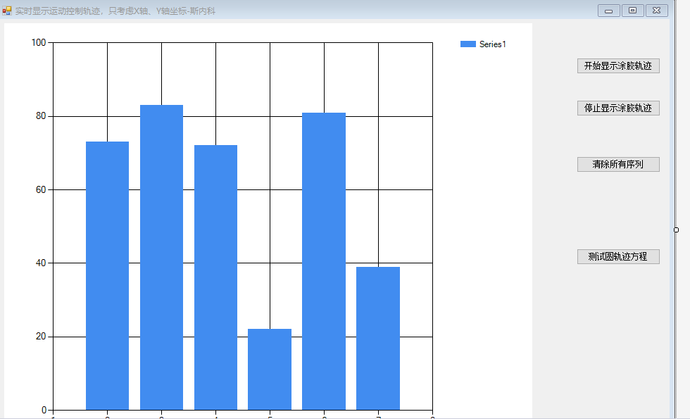 {partial class FormShowGlueTrack{/// <summary>/// Required designer variable./// </summary>private System.ComponentModel.IContainer components = null;/// <summary>/// Clean up any resources being used./// </summary>/// <param name="disposing">true if managed resources should be disposed; otherwise, false.</param>protected override void Dispose(bool disposing){if (disposing && (components != null)){components.Dispose();}base.Dispose(disposing);}#region Windows Form Designer generated code/// <summary>/// Required method for Designer support - do not modify/// the contents of this method with the code editor./// </summary>private void InitializeComponent(){System.Windows.Forms.DataVisualization.Charting.ChartArea chartArea2 = new System.Windows.Forms.DataVisualization.Charting.ChartArea();System.Windows.Forms.DataVisualization.Charting.Legend legend2 = new System.Windows.Forms.DataVisualization.Charting.Legend();System.Windows.Forms.DataVisualization.Charting.Series series2 = new System.Windows.Forms.DataVisualization.Charting.Series();this.chart1 = new System.Windows.Forms.DataVisualization.Charting.Chart();this.button1 = new System.Windows.Forms.Button();this.button2 = new System.Windows.Forms.Button();this.button3 = new System.Windows.Forms.Button();this.button4 = new System.Windows.Forms.Button();((System.ComponentModel.ISupportInitialize)(this.chart1)).BeginInit();this.SuspendLayout();// // chart1// chartArea2.Name = "ChartArea1";this.chart1.ChartAreas.Add(chartArea2);legend2.Name = "Legend1";this.chart1.Legends.Add(legend2);this.chart1.Location = new System.Drawing.Point(6, 6);this.chart1.Name = "chart1";series2.ChartArea = "ChartArea1";series2.Legend = "Legend1";series2.Name = "Series1";this.chart1.Series.Add(series2);this.chart1.Size = new System.Drawing.Size(750, 600);this.chart1.TabIndex = 0;this.chart1.Text = "chart1";// // button1// this.button1.Location = new System.Drawing.Point(819, 55);this.button1.Name = "button1";this.button1.Size = new System.Drawing.Size(119, 23);this.button1.TabIndex = 1;this.button1.Text = "开始显示涂胶轨迹";this.button1.UseVisualStyleBackColor = true;this.button1.Click += new System.EventHandler(this.button1_Click);// // button2// this.button2.Location = new System.Drawing.Point(819, 115);this.button2.Name = "button2";this.button2.Size = new System.Drawing.Size(119, 23);this.button2.TabIndex = 2;this.button2.Text = "停止显示涂胶轨迹";this.button2.UseVisualStyleBackColor = true;this.button2.Click += new System.EventHandler(this.button2_Click);// // button3// this.button3.Location = new System.Drawing.Point(819, 195);this.button3.Name = "button3";this.button3.Size = new System.Drawing.Size(119, 23);this.button3.TabIndex = 3;this.button3.Text = "清除所有序列";this.button3.UseVisualStyleBackColor = true;this.button3.Click += new System.EventHandler(this.button3_Click);// // button4// this.button4.Location = new System.Drawing.Point(819, 326);this.button4.Name = "button4";this.button4.Size = new System.Drawing.Size(119, 23);this.button4.TabIndex = 4;this.button4.Text = "测试圆轨迹方程";this.button4.UseVisualStyleBackColor = true;this.button4.Click += new System.EventHandler(this.button4_Click);// // FormShowGlueTrack// this.AutoScaleDimensions = new System.Drawing.SizeF(6F, 12F);this.AutoScaleMode = System.Windows.Forms.AutoScaleMode.Font;this.ClientSize = new System.Drawing.Size(951, 621);this.Controls.Add(this.button4);this.Controls.Add(this.button3);this.Controls.Add(this.button2);this.Controls.Add(this.button1);this.Controls.Add(this.chart1);this.Name = "FormShowGlueTrack";this.Text = "实时显示运动控制轨迹,只考虑X轴、Y轴坐标-斯内科";this.Load += new System.EventHandler(this.FormShowGlueTrack_Load);((System.ComponentModel.ISupportInitialize)(this.chart1)).EndInit();this.ResumeLayout(false);}#endregionprivate System.Windows.Forms.DataVisualization.Charting.Chart chart1;private System.Windows.Forms.Button button1;private System.Windows.Forms.Button button2;private System.Windows.Forms.Button button3;private System.Windows.Forms.Button button4;}