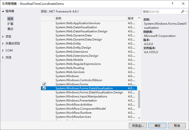 新建窗体应用程序ShowRealTimeCoordinateDemo,将默认的Form1重命名为FormShowGlueTrack,添加对System.Windows.Forms.DataVisualization图表框架的引用。