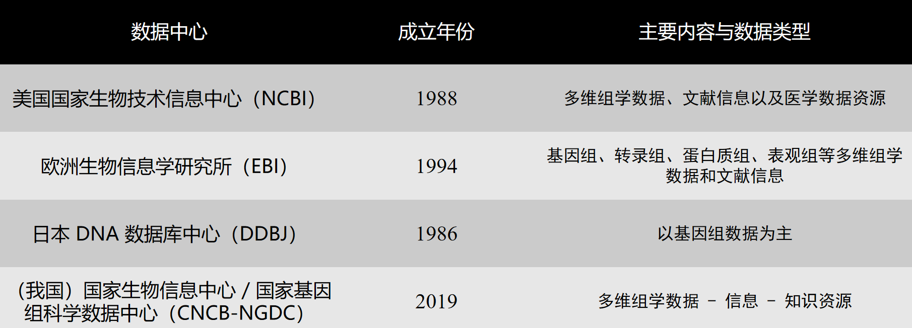 现今,美国国家生物技术信息中心主要针对的是生物技术和生物医学领域的数据,致力于创立自动化系统用于储存和分析相关数据和知识,促进科研和医疗团体对这些数据库进行数据获取与使用,协调国内外生物数据信息的收集与整合。