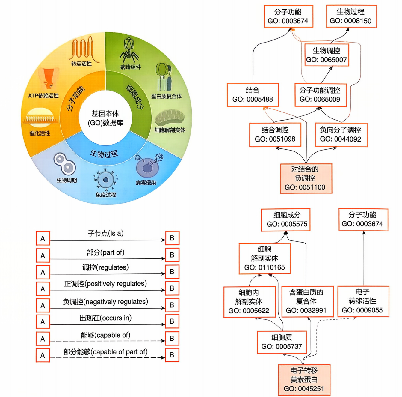 GO 通过 “term” 定义功能标签,标签间以is_a、part_of、regulates等关系构建有向无环网络,形成功能层级结构(如书中下图)。