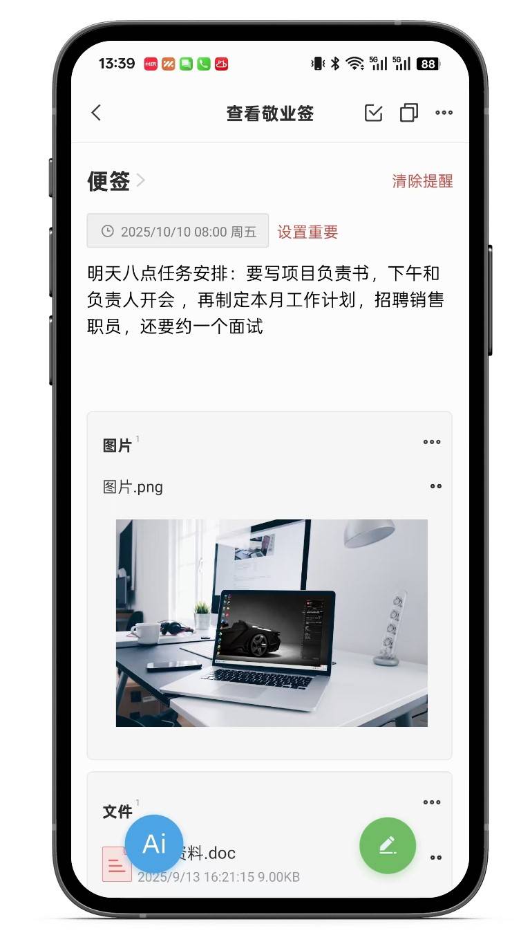 敬业签堪称跨平台备忘录的“六边形战士”。它完美兼容安卓、苹果手机及电脑、平板等多设备,数据实时同步。内容记录上支持文字、图片、视频、音频及Word、TXT等多种格式,并具有AI创作功能,接入Deepseek大模型,记录时遇到疑问可随时答疑,进行创作。而且它支持多种提醒方式,确保任务不遗漏。还能做任务打卡,非常适合上班族!