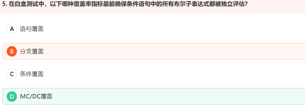 实际上,更严格的标准(如条件组合覆盖MC/DC)会要求既覆盖每个条件,又能体现出每个条件对最终结果的独立影响。
