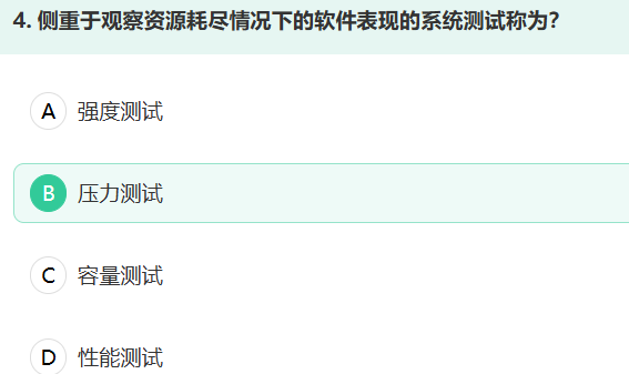 A. 强度测试 - 主要测试系统在正常负载条件下长期运行的可靠性,不是专门针对资源耗尽情况
