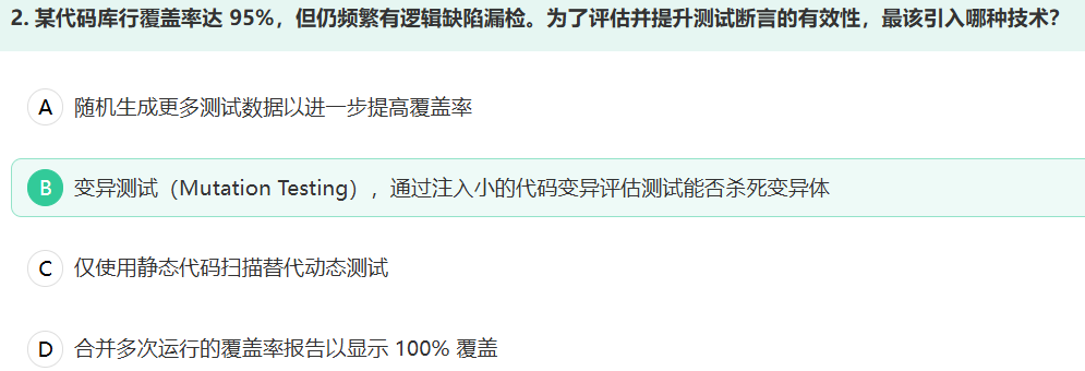 核心思想:这是一种评估测试用例有效性的高阶技术。它会在源代码中故意制造一些小的人为错误(即“变异”,例如将 +改为 -,或将 >改为 >=),然后运行现有的测试套件。
